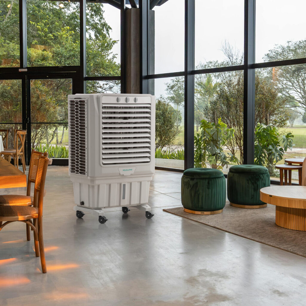 O climatizador consome até 90% menos energia em relação ao ar-condicionado, pois funciona sem compressor.